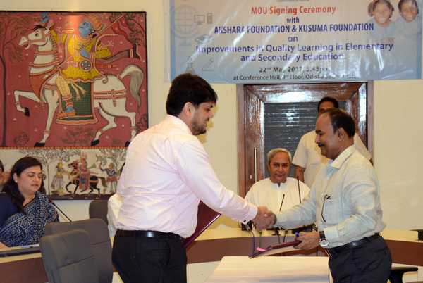 An MoU being signed between School & Mass Education Department and Kusuma Foundation in presence of Chief Minister Shri Naveen Patnaik at Secretariat
